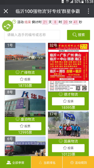 2017年12月4日,在为我园区华中物流投票时发现,我物流公司也在“群星争霸”的赛事中,票数为一千多票,排在第12名,当时非常激动,董事长马守田亲自组织,副总主持,召开广缘物流专线经理和各部门会议,专题研究利用此次赛事,把广缘物流积累的二十余年的能量发挥出来,把客户群体对广缘的信赖感调动起来,同时召开各分公司视频会议,让收货人对广缘物流做更加全面的评价。